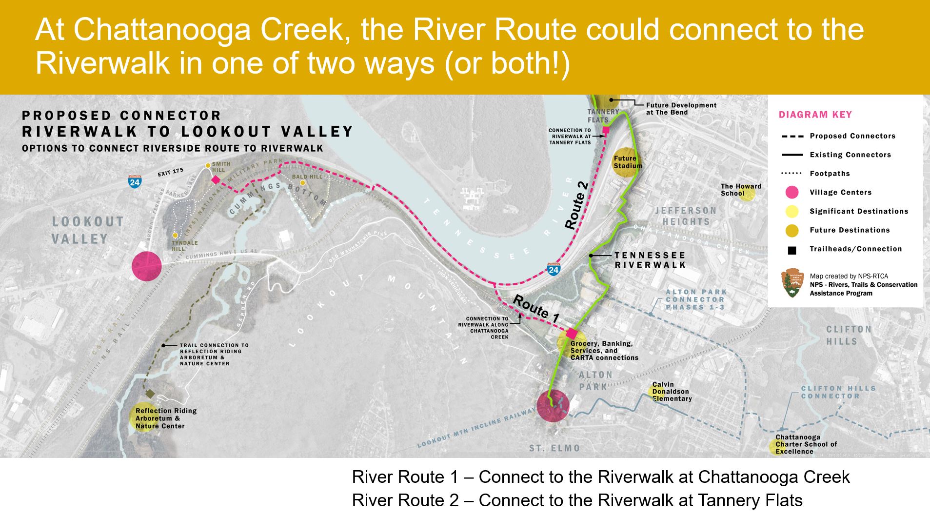 Below is a preliminary map of potential greenway connections from the existing Riverwalk to Lookout Valley that could connect new and existing destinations, including Reflection Riding, future park property at Cummings Bottom, and the coming development at The Bend and South Broad (New Lookouts Stadium) districts. Our goal is to get a Feasibility Study funded that would result in a much more robust and complete greenway plan, ideally in conjunction with the TDOT project to widen I-24.