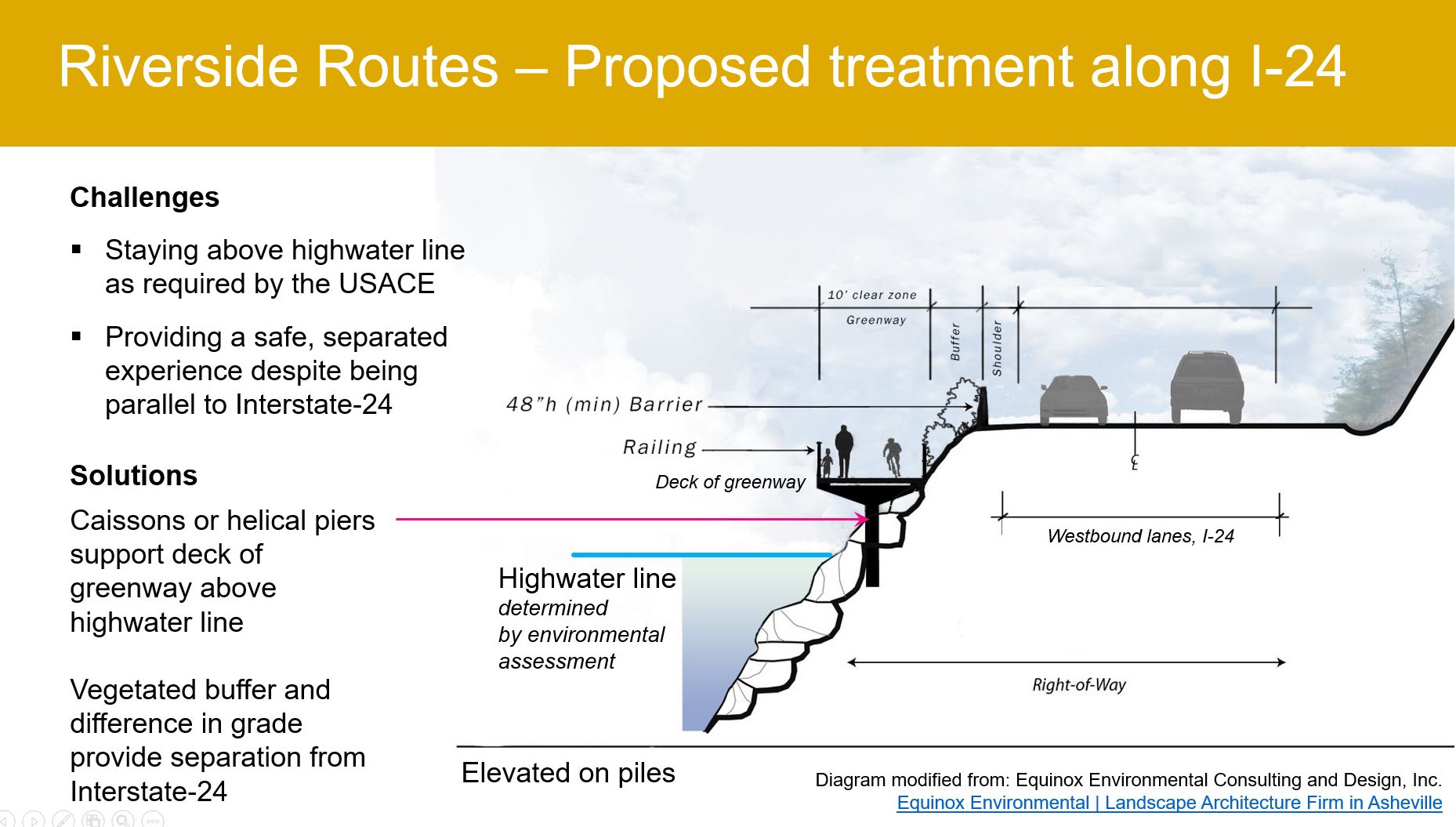 The image below depicts one viable solution to installing the greenway in the tight space between I-24 and the Tennessee River from Lookout Creek to the west around to Chattanooga Creek (or further to Tannery Flats) to the east. Similar installations have been completed in other locations with success, and we feel it is the best solution here.